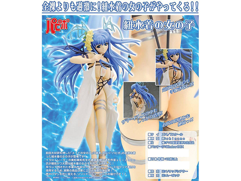 「パピポ」の表紙を飾った紐水着の女の子が登場です!イラストレーター美和美和先生の徹底監修と造型作家shinano氏が緻密かつ大胆に紐水着の女の子を作り上げました!辛うじて残された水着の布部分や身に纏うサマードレスはクリア素材を使用するため、実際の商品は更にエロス指数が急上昇!!男のロマンを形に変える、ソリッドシアターからのお届けです!!