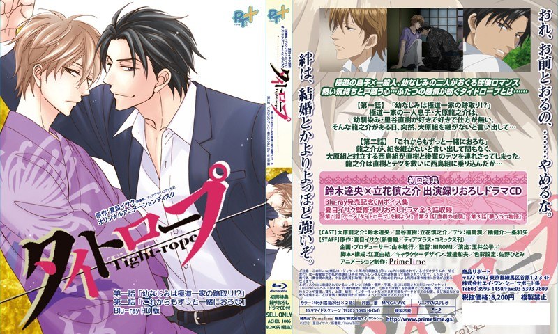 あらすじ第一話「幼なじみは極道一家の跡取り!?」極道一家の一人息子・龍之介は幼馴染の直樹のことが好きで好きで仕方がない!そんな龍之介がある日突然組は継がないと言い出して…。直樹への想いと自分の将来…揺れる思春期○校生。心と身体の終着点は…?第二話「これからもずっと一緒におろな」幼馴染の直樹のことが好きで好きで仕方がない、極道一家(大原組)の一人息子・龍之介。龍之介の事は嫌いではないが、なかなか最後の一線を越える事が出来ない直樹。ある日、大原組と対立する西島組が、直樹とテツを連れ去ってしまう。怒り心頭で西島組に乗り込む龍之介。大乱闘の末、龍之介は直樹を救出するのだが……。直樹の胸に倒れ込む龍之介。鉄の匂いと共に受け止めた直樹の手が真っ赤に染まる。…熱い気持と戸惑う心…2つの感情が紡ぐ『タイトロープ』の結末とは!?