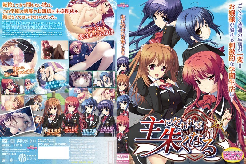遂に徳望のDVDPG化決定!「主に交われば朱くなる」ごくごく一般的に、普通と呼ばれる学園生活を送るはずだった秋津ハジメは、親の都合で資産家のご子息・ご令嬢が多く通うエルデ学園へと転校することになった。普通の生活から一変し、高貴な人々が溢れる学園生活に刺激を受け始めるハジメ。ハジメの学園生活が色鮮やかに移ろいだす――