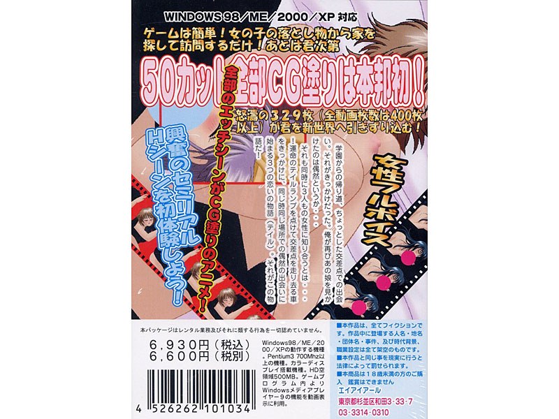 全部のえっちシーンがCG塗りの純国産アニメ!!さわやか系!フルアニメーションHゲーム登場!学園からの帰り道、ちょっとした交差点での出会い。それがきっかけだった。俺が再びあの娘を見かけたのは偶然というか…それも同時に3人もの女性に知り合うとは…!運命のテイルランプを点けて交差点を走り去る車をきっかけに、同じ時同じ場所での偶然の出会いに始まる3つの恋の物語(テイル)。
